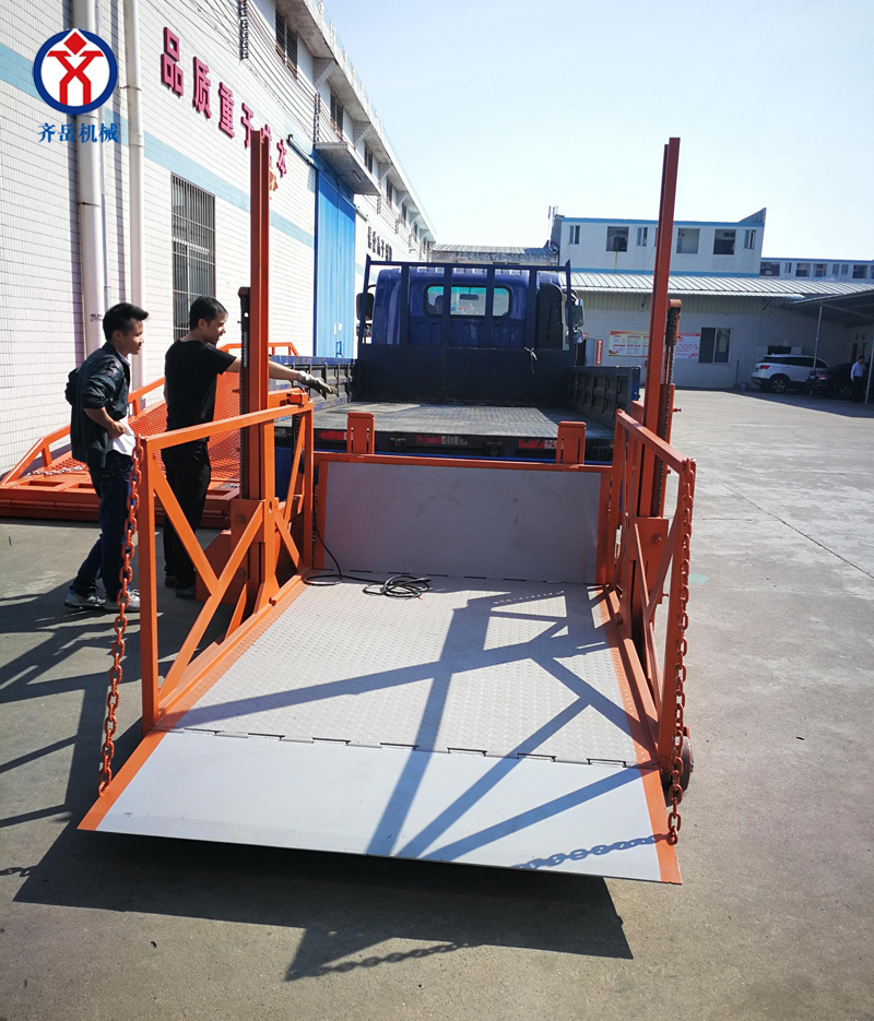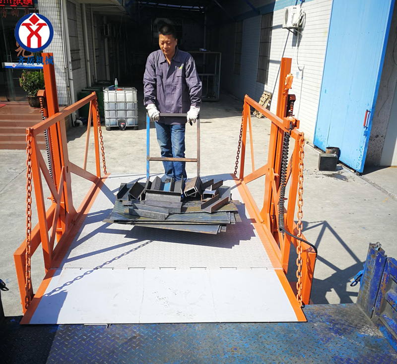 4. 在(zài)裝卸貨時,貨物推上(shàng)平台後,應將平台前麵的防護鏈條掛上(shàng),預防貨物滑落。