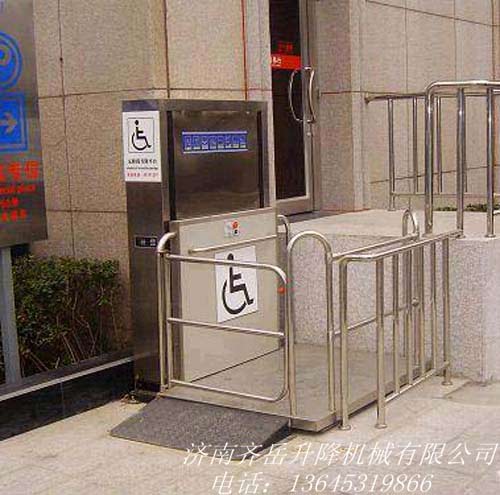 殘疾人升降機由升降平台、導軌(guǐ)和驅動箱等三大部分(fèn)組成;升降平台是由(yóu)C型鋼材為主體部件,采用“翹板自複位開關作運行”, 無(wú)基坑式安(ān)裝,直接固定於混凝土地麵(無底坑室外(wài)應用情況下,平台下方混凝土地麵不(bú)得低於周圍地麵),手動液壓閥打開時升降底板能手動下降;液壓驅動,升降平穩安全(quán),外部采用拉絲不鏽(xiù)鋼材料和鋁板靜電噴塑機箱/麵板,外(wài)形小巧美觀(guān),不阻礙周邊環境。殘疾人升降平台直接安裝於地麵,無需(xū)土建配(pèi)套地坑,施工簡便,產品放置戶外不易積水,不易生鏽,維護簡便。