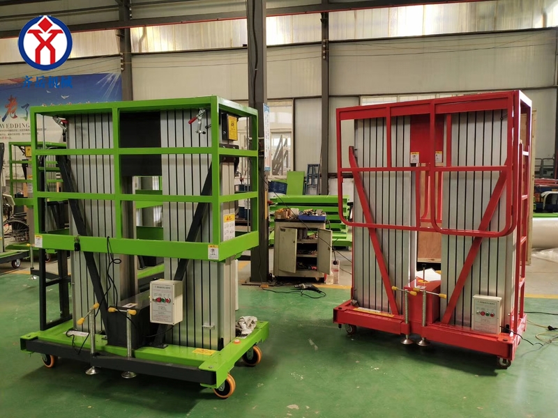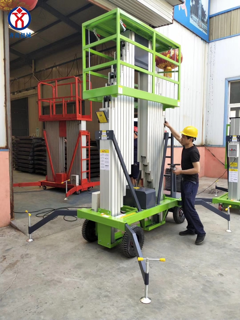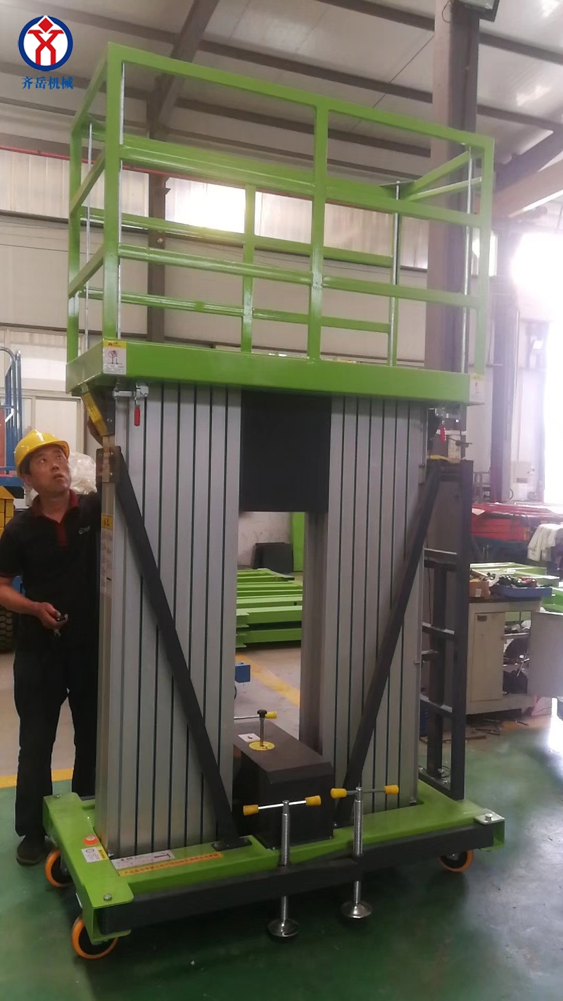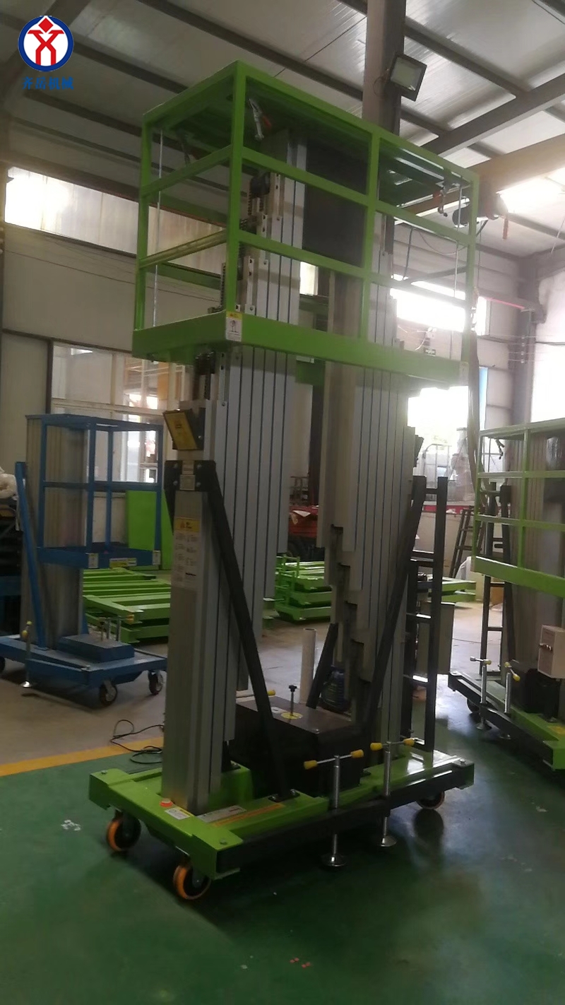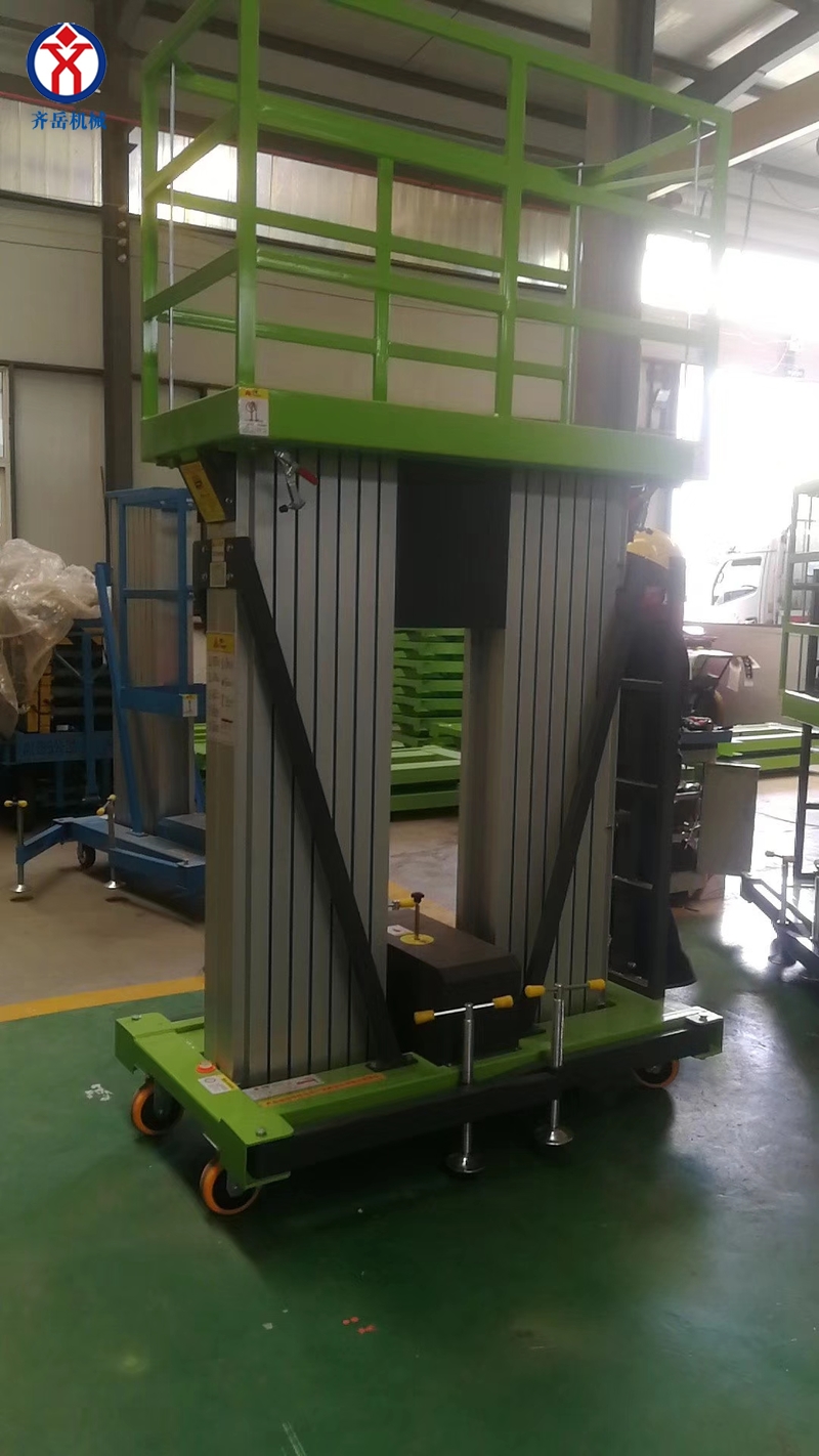 6、雙柱鋁合金升降機高度從8-12米不等,載重100-300KG,適合單人或者雙人高空作業(yè),自身隻有幾百KG單人移動很方便。