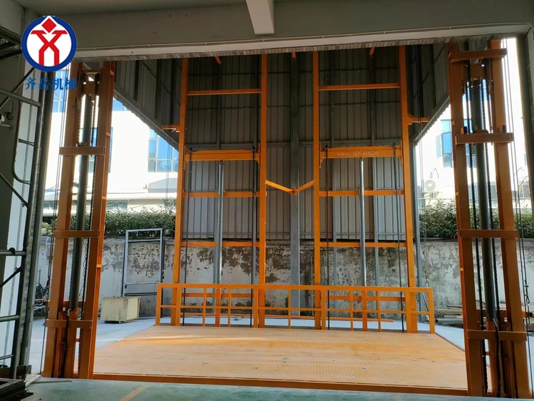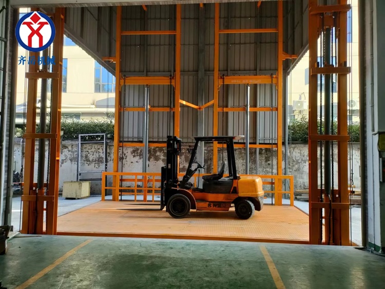 承載10噸導軌式四缸八柱升降平台直角進出貨設備交付(fù)使用